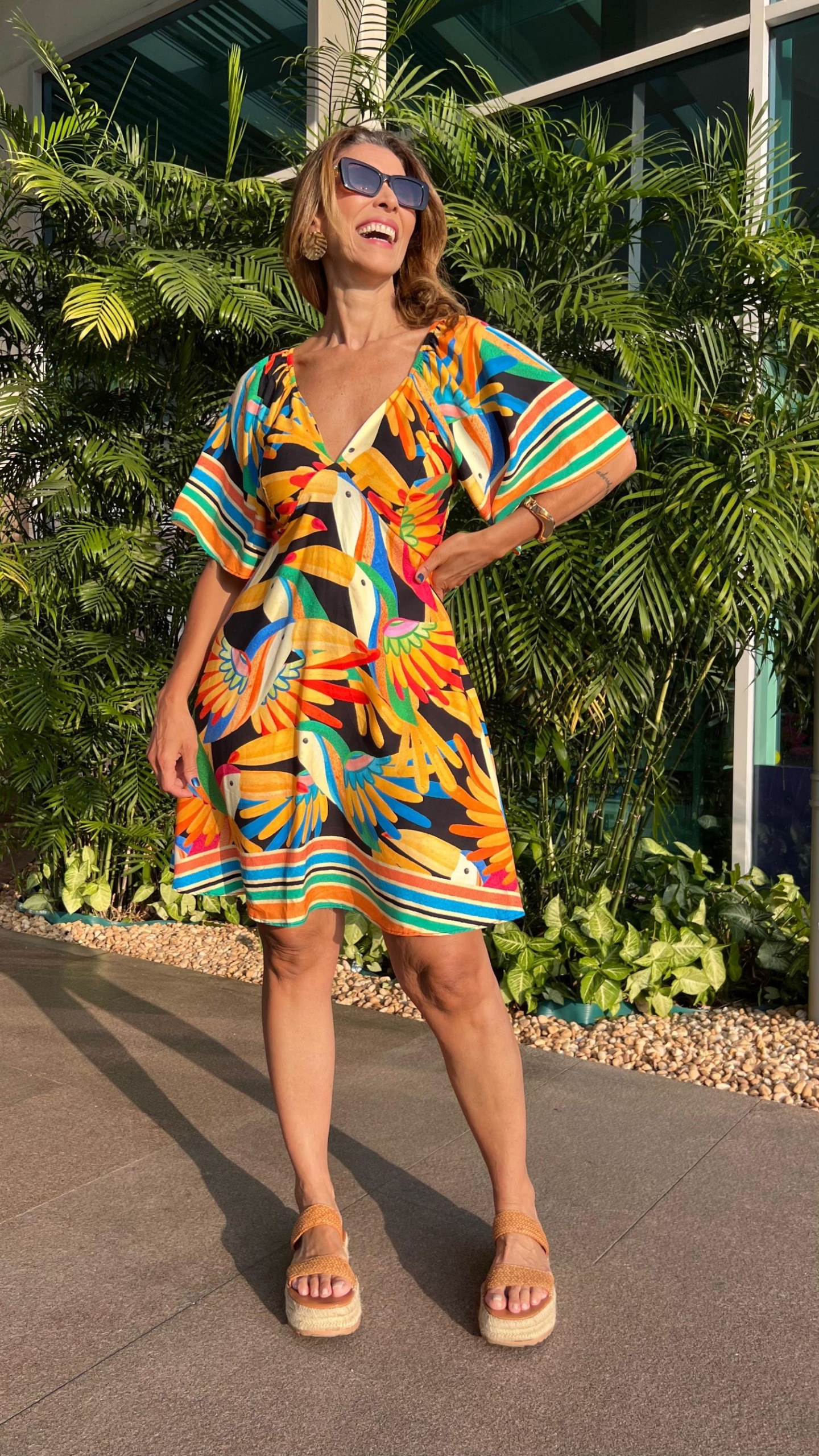 A estampa floral em tons vibrantes deixa a peça ainda mais charmosa, trazendo aquele toque tropical que ilumina qualquer produção. As mangas amplas e o decote V valorizam o visual com modernidade e leveza.